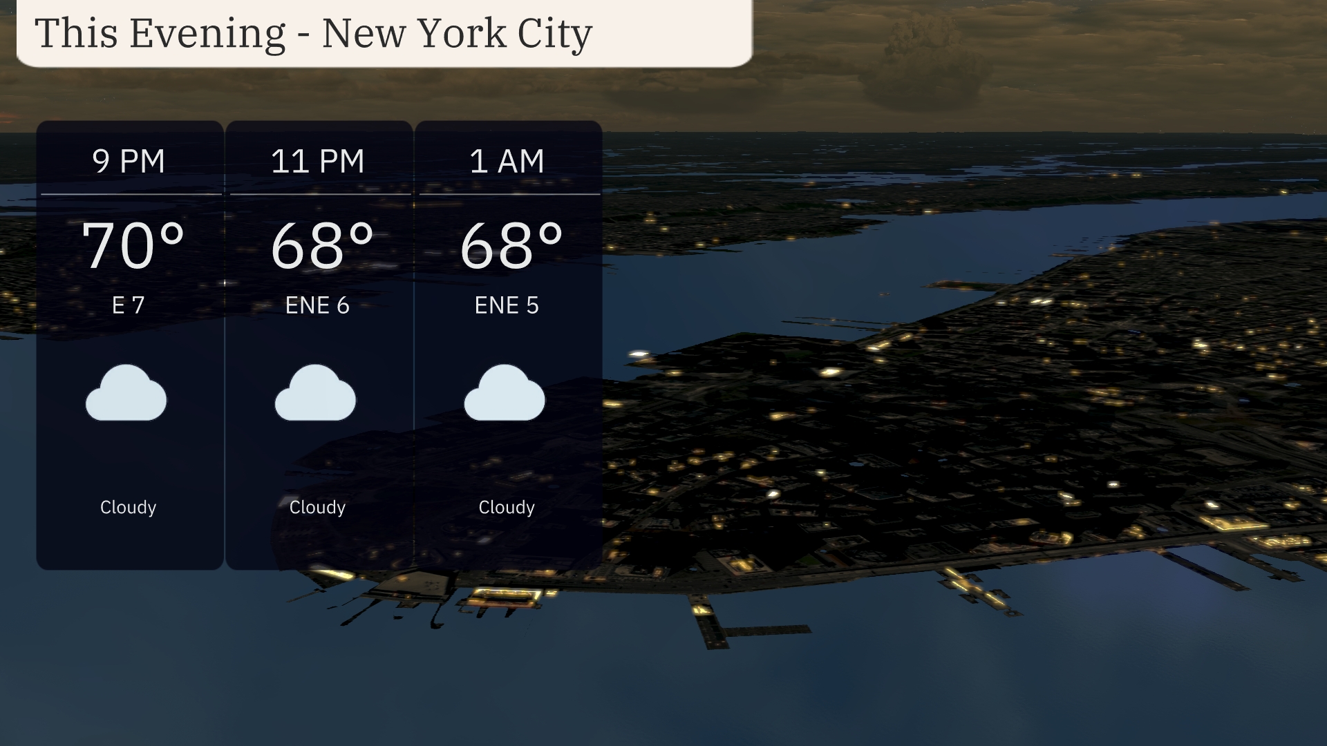 For this evening in New York City, expect cloudy skies throughout the night. Temperatures will start at 70 degrees at 9 PM, cooling slightly to 68 degrees by midnight. Winds will blow gently from the east, ranging from 5 to 7 miles per hour.