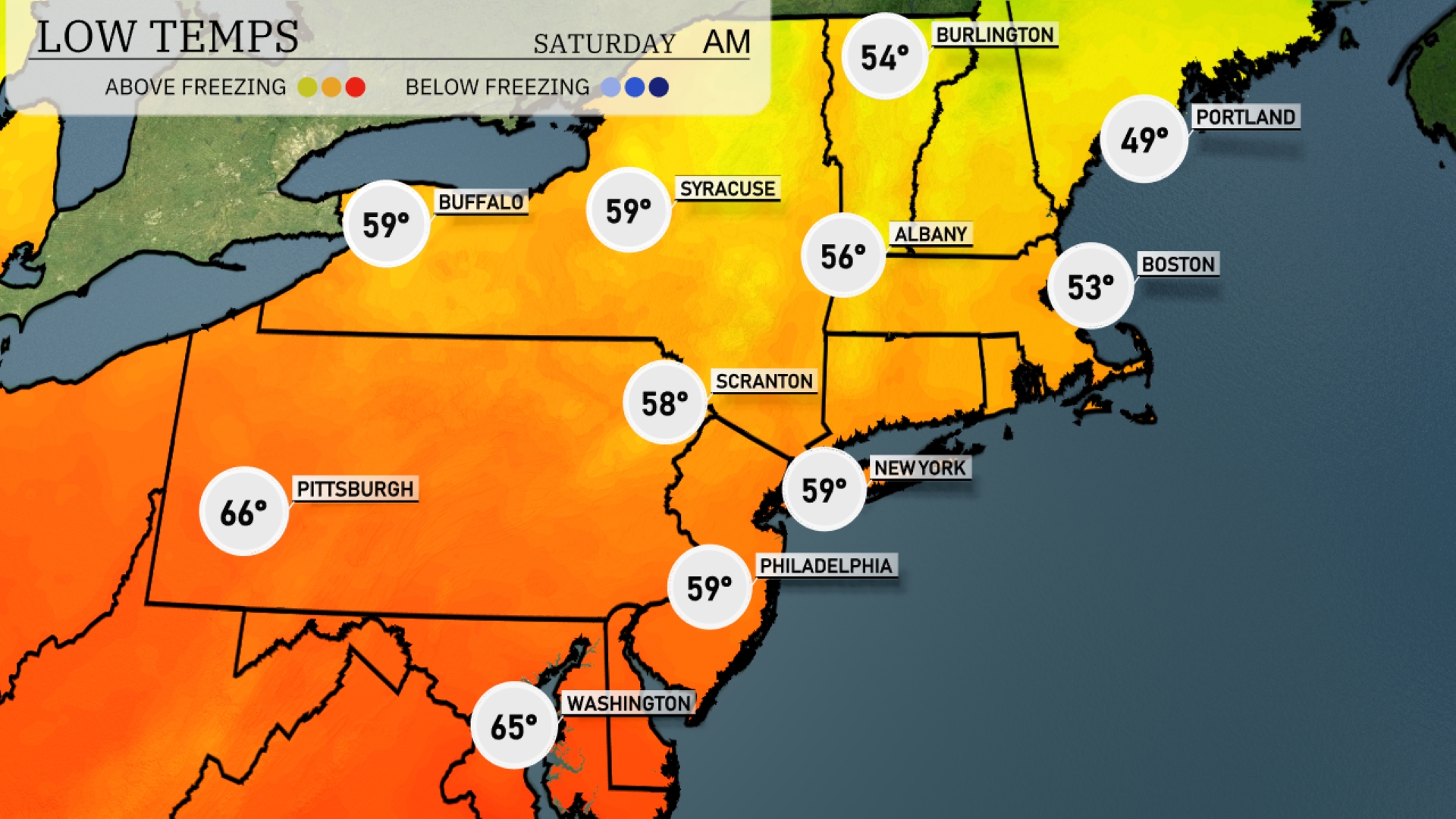 Tonight, Boston will see a low of 53 degrees, while Portland will drop to a cooler 49. The temperature in Albany will reach 56, and Scranton will cool down to 58 degrees. Expect Syracuse and Buffalo to remain steady at 59 degrees overnight.