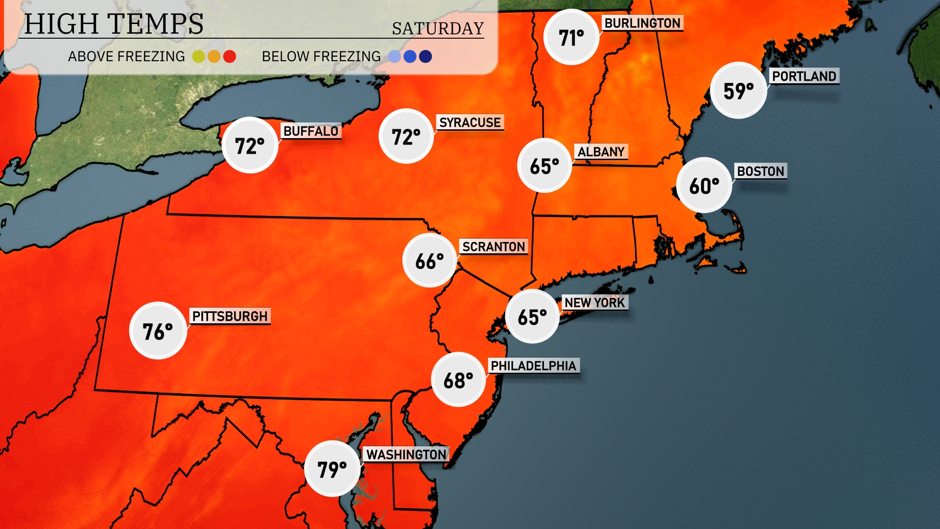 Tomorrow, the Northeast will experience a warm day with highs reaching 76 degrees in Pittsburgh. Buffalo and Syracuse are expected to hit 72 degrees, while Philadelphia will see a high of 68 degrees. Boston stays cooler, with a high around 60 degrees, and Portland will only manage to reach 59 degrees