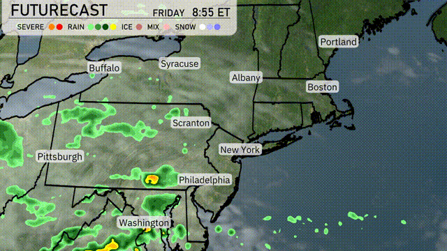 A line of showers extends from Pittsburgh to Philadelphia, moving northeast and reaching New York City and Albany by tomorrow afternoon. Expect moderate rain with potential for localized flash flooding, particularly in lower-lying urban areas. Keep an eye on Philadelphia and New York City, as the heaviest rain will pass through these regions. Temperatures will remain mild, but as the front moves off the coast late Friday, clearing skies are expected. Key takeaway: Be prepared for wet commutes and possible travel delays in the Northeast.