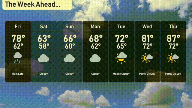 For the 7 day forecast in New York City: Friday: Anticipate rain late with a high of 78 degrees and a low of 62 degrees. Saturday: Look for cloudy skies with a cooler high of 63 degrees and a low of 58 degrees. Sunday: Remaining cloudy with temperatures rising to 66 degrees and a low of 60 degrees. Monday: The cloud cover persists with a high reaching 68 degrees and a low of 62 degrees. Tuesday: Mostly cloudy, the temperature will peak at 72 degrees, cooling to 65 degrees overnight. Wednesday: Expect partly cloudy skies, and a warmer high of 81 degrees, with a low of 72 degrees. Thursday: Partly cloudy as we hit a warming trend, reaching a high of 87 degrees and a low remaining at 72 degrees.