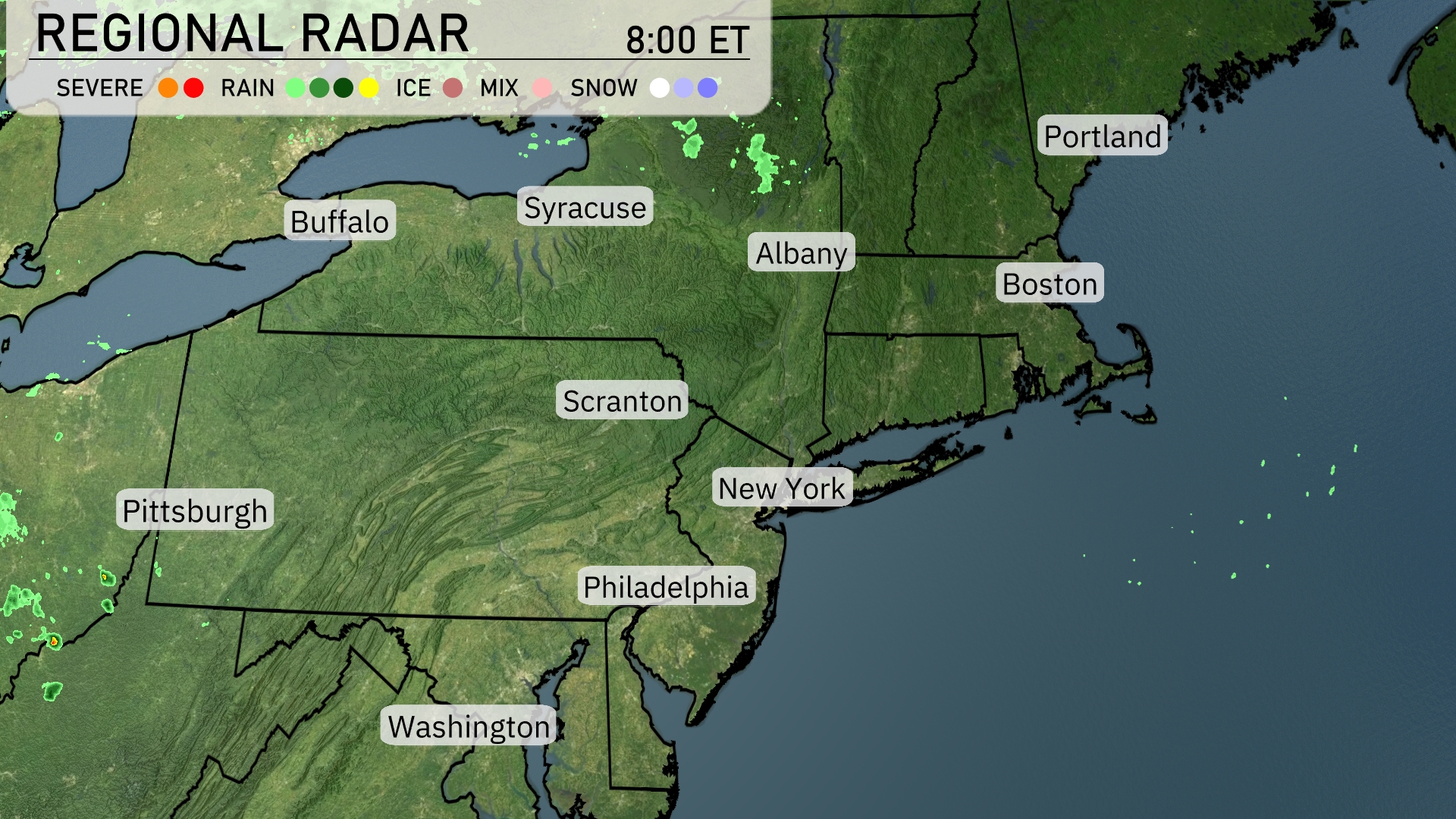 The Northeast is experiencing mostly clear skies with no significant storm systems in place. A few light showers are brushing the far western regions near Pittsburgh, but they are minimal and not widespread. Syracuse remains dry with clear conditions expected throughout the day. Coastal areas, including New York City and Boston, are enjoying fair weather, perfect for outdoor activities.
