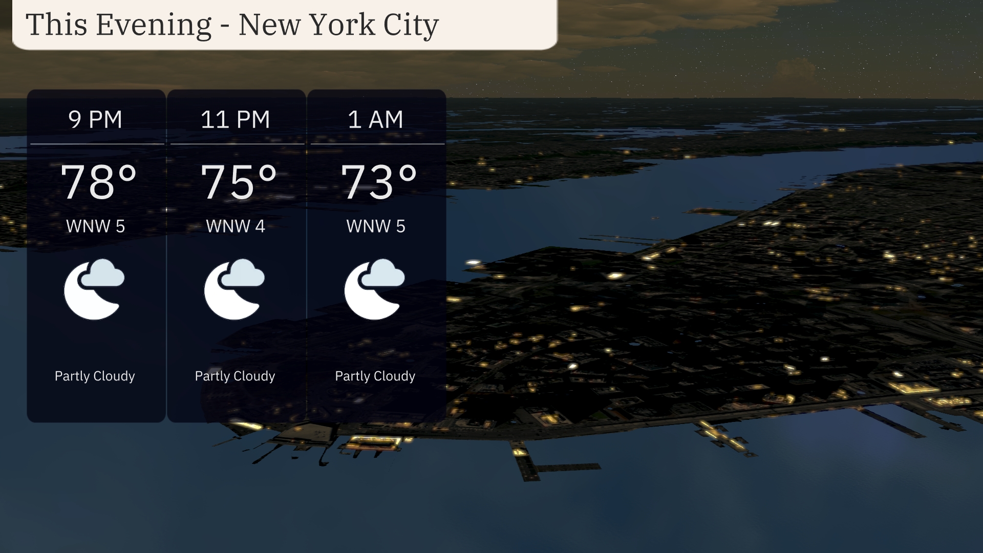 Temperatures in New York City this evening will dip gently from 78 degrees at 9 PM down to 73 degrees by 1 AM. Expect partly cloudy skies throughout, providing a pleasant backdrop for any late-night activities. Winds will be light from the west-northwest, hovering around 4 to 5 miles per hour, ensuring a calm evening.
