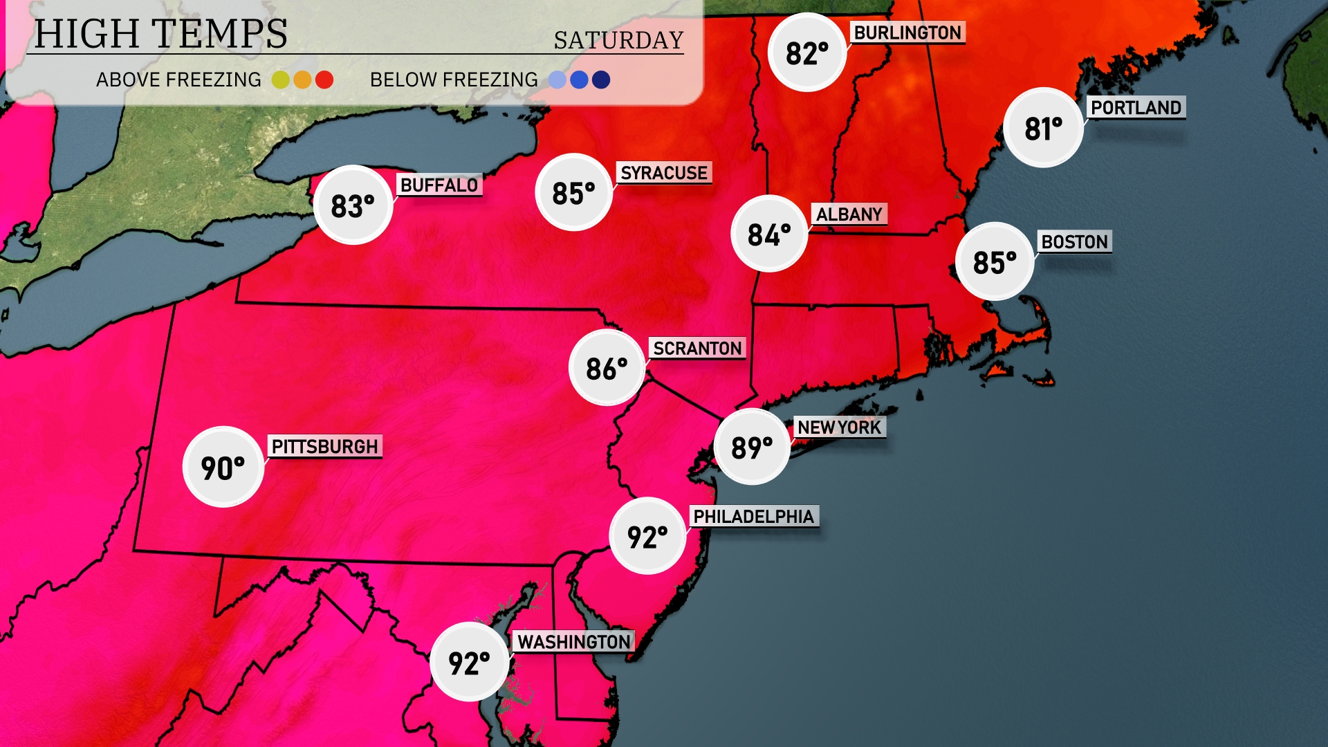 Tomorrow in the Northeast, temperatures are set to soar. Philadelphia will reach a sizzling 92 degrees, while New York City is just behind at 89. Scranton expects a high of 86 degrees, and Syracuse isn’t far off at 85 degrees. Buffalo will enjoy a comfortable 83, with Boston also experiencing a warm day at 85. This heatwave marks an above-average trend for the season, influenced by a dominating high-pressure system in the region.