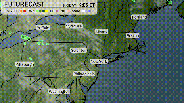 Expect a soggy day across the Northeast with widespread rain showers moving through the region from west to east. In cities like Pittsburgh and Scranton, rain begins early, extending toward New York City and Boston by late afternoon. Some areas, particularly in upstate New York and Vermont, might experience brief thunderstorms. Temperatures remain mild, hovering in the low 70s, slightly cooler near the coast under persistent cloud cover.