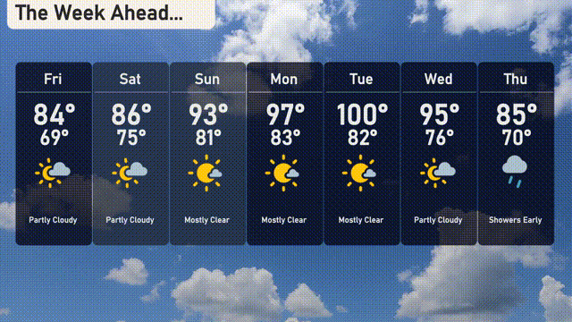 Friday: The sky remains partly cloudy with a high of 84 degrees and evening lows of 69 degrees.