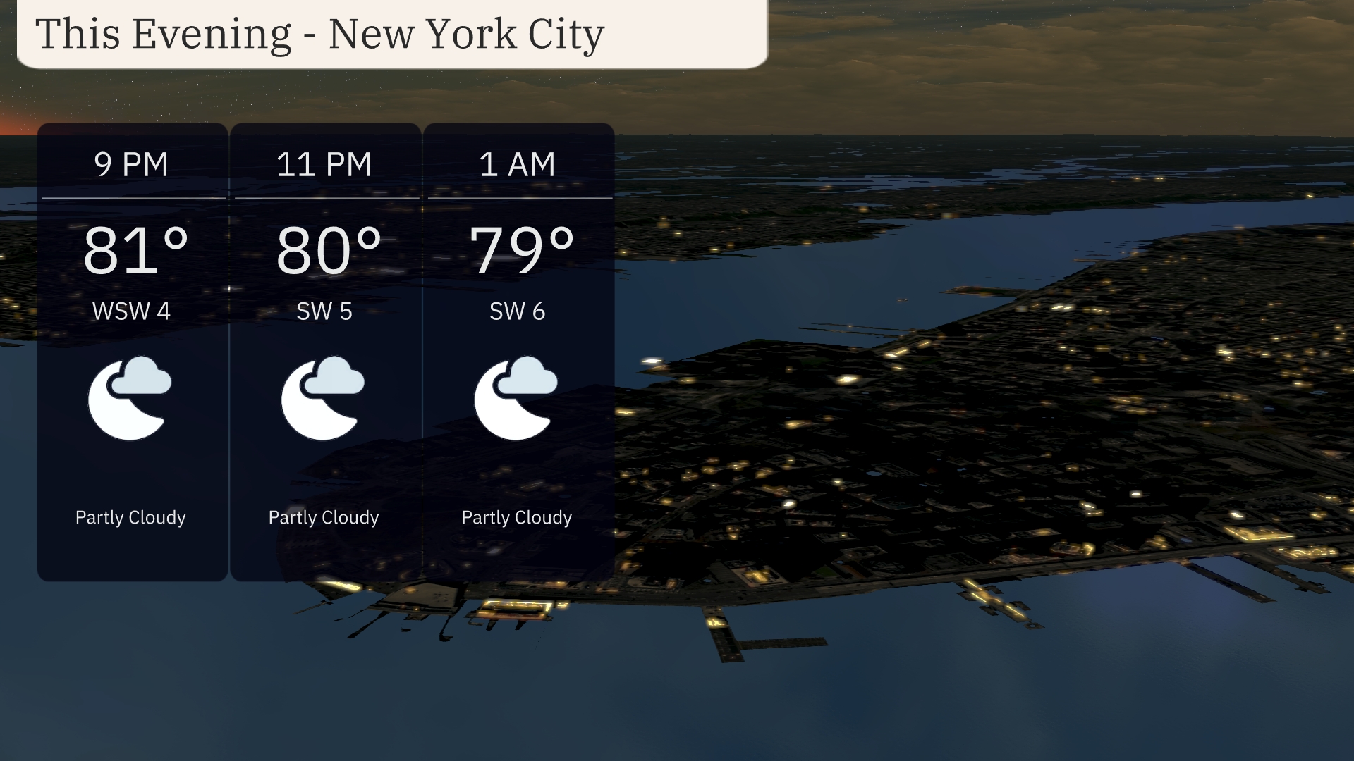 For this evening in New York City, expect partly cloudy skies. Temperatures will start at 81 degrees at 9 PM, gently cooling to 79 degrees by 1 AM. Winds will remain light, shifting from the west-southwest at 4 miles per hour to 6 miles per hour by midnight.