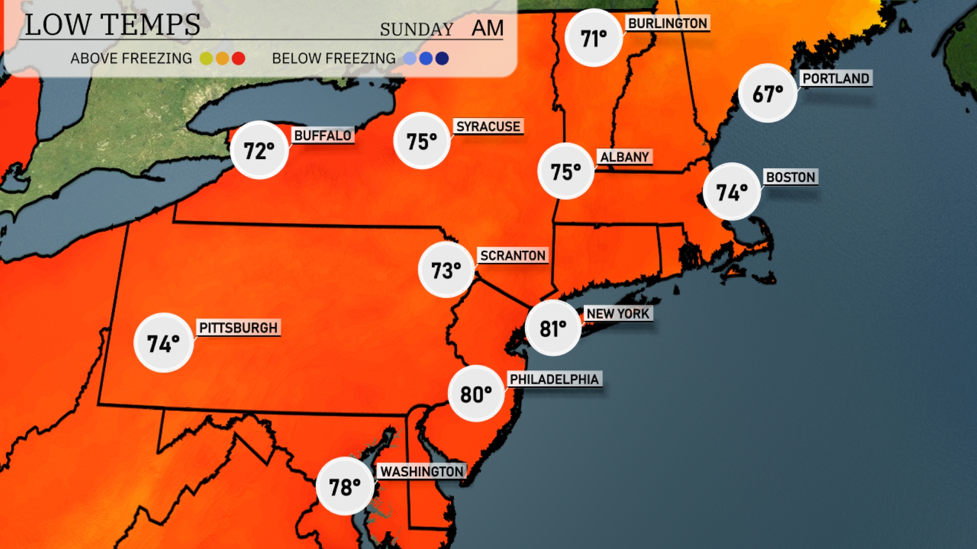 Tonight, temperatures in the Northeast will remain unseasonably warm with New York expected to drop to 81 degrees. Philadelphia will see a low of 80 degrees, while Scranton cools to 73. Boston is forecast to reach a low of 74 degrees, and Buffalo will settle at 72 degrees.