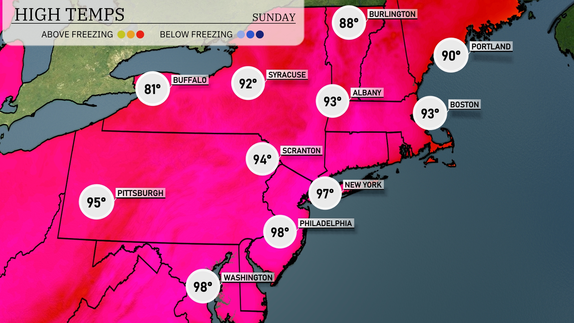 Tomorrow, New York City is set to reach a sizzling 97 degrees, while Philadelphia could peak at a sweltering 98 degrees. Scranton will see highs around 94, closely following the trend of above-average temperatures across the region. In the northern tier, Syracuse is expected to hit 92 degrees, with Buffalo slightly cooler at 81. Boston isn’t far behind, as it’s projected to reach 93, enjoying a warm afternoon alongside Portland at 90.