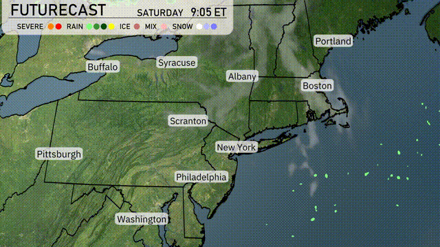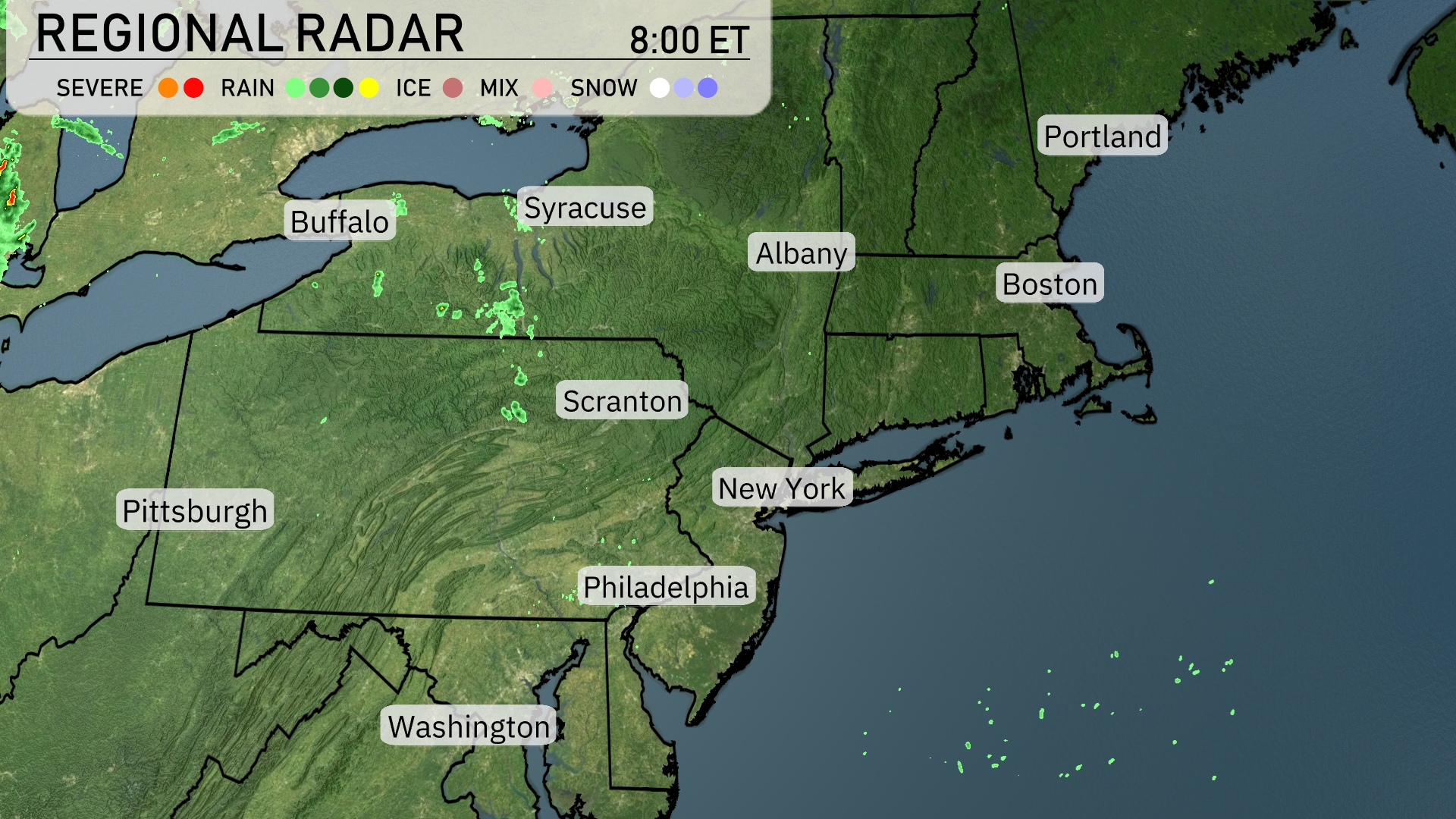 A cluster of light rain showers is moving through northern Pennsylvania towards Scranton and extending into parts of western New York near Buffalo and Syracuse. Meanwhile, cloud cover is stretching across New York City, Philadelphia, and Washington, D.C., indicating a chance of scattered showers later in the day. The rest of the Northeast region, including Albany and Boston, remains dry, and a heat wave is underway.