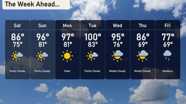 Tuesday: Partly cloudy skies and temperatures reaching 100 degrees for the high and 83 degrees for the low.