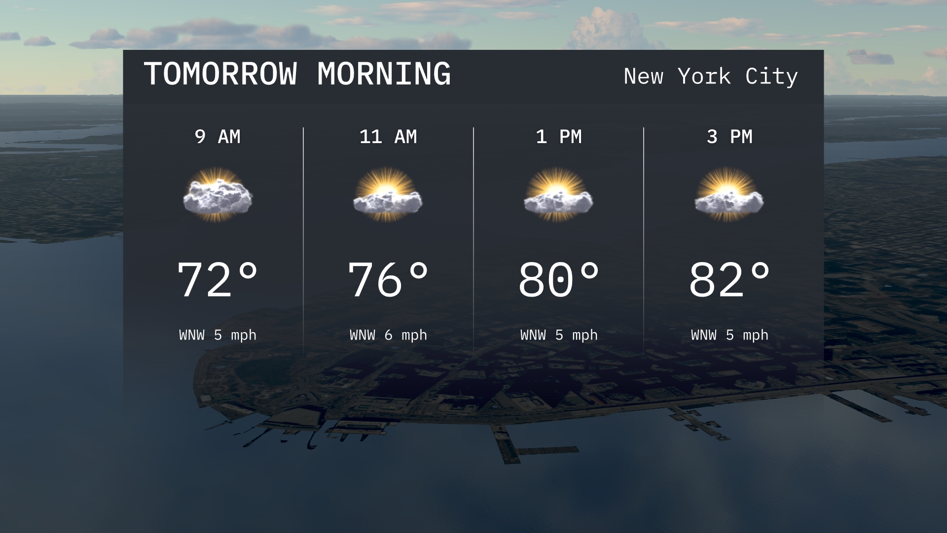For Tomorrow Morning in New York City, temperatures start at 72 degrees with a light west-northwest wind at 5 miles per hour. By 11 a.m., expect temperatures to rise to 76 degrees under partly cloudy skies with winds shifting slightly to 6 miles per hour. The trend continues with temperatures reaching 80 degrees by 1 p.m. while maintaining a calm wind pattern.