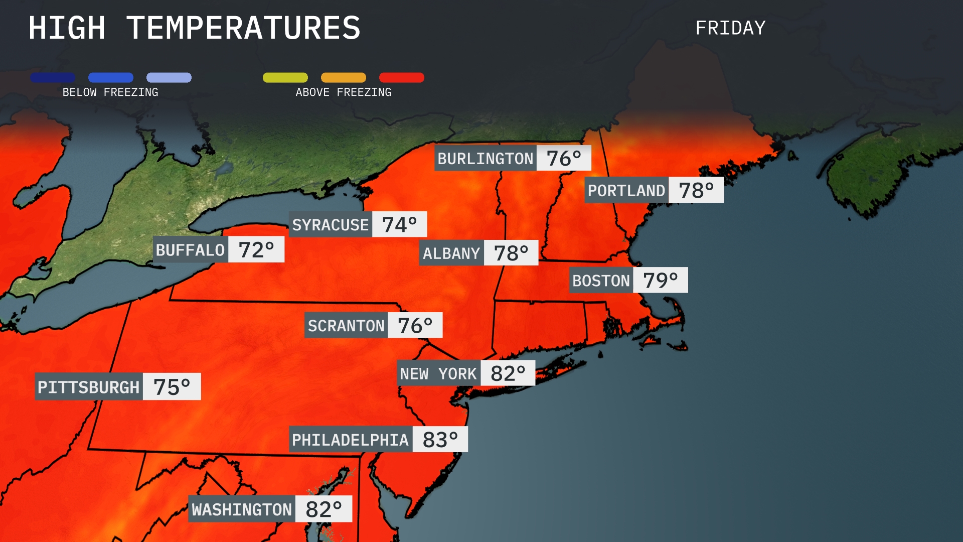 Tomorrow, high temperatures in the Northeast are shaping up to be quite warm for this time of year. New York City will hit 82 degrees, while Philadelphia can expect a slightly warmer 83 degrees. Boston is on track for a pleasant 79 degrees, with Albany also reaching 78 degrees. Scranton and Pittsburgh will be a bit cooler, with highs of 76 and 75 degrees respectively. Overall, temperatures are trending above average, influenced by a persistent warm air mass over the region.