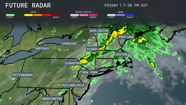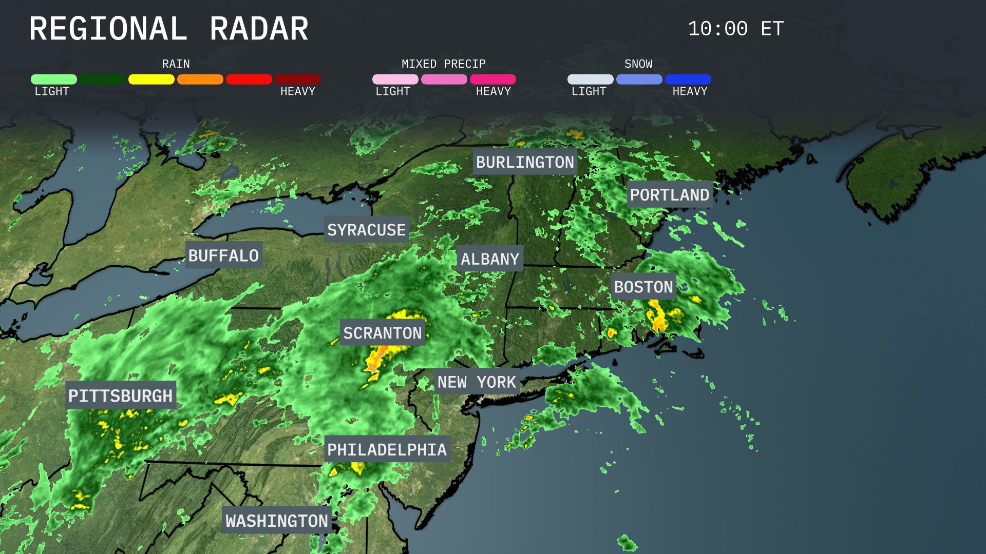 Rain is sweeping through much of the Northeast, with moderate to heavy precipitation particularly impacting Scranton and Boston. Albany and Syracuse are also under areas of consistent rain, while Burlington sees lighter showers extending northward. New York and Philadelphia are experiencing a brief respite with lighter, scattered rain. Portland sits on the edge of a thick band of rain, hinting at potential heavier rainfall moving in.
