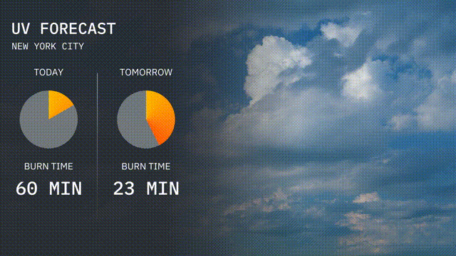 Today in New York City, the UV index is low, leading to an extended burn time of 60 minutes, thanks to the cloudy skies blocking harmful rays. However, as we move into tomorrow, the UV index climbs to moderate levels, reducing the burn time to just 23 minutes.