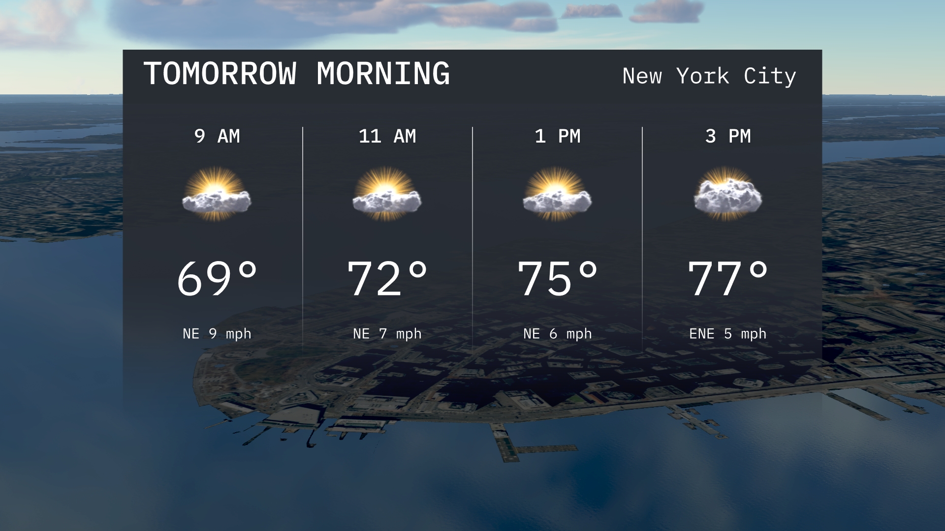 Tomorrow morning in New York City will be pleasantly mild. Temperatures will start at 69 degrees by 9 AM, climbing to 72 degrees by 11 AM. Expect partly sunny skies with a gentle northeast breeze.