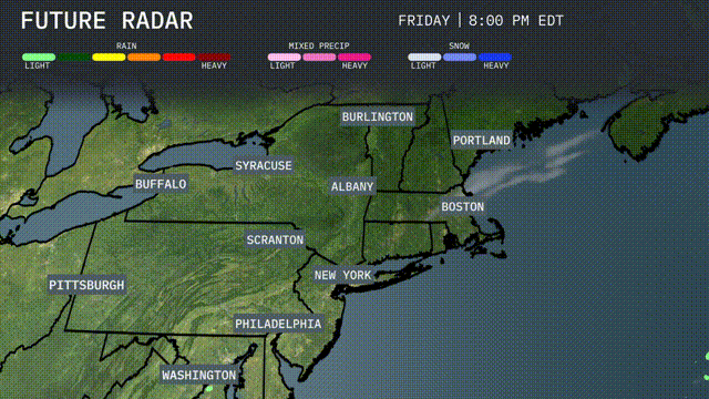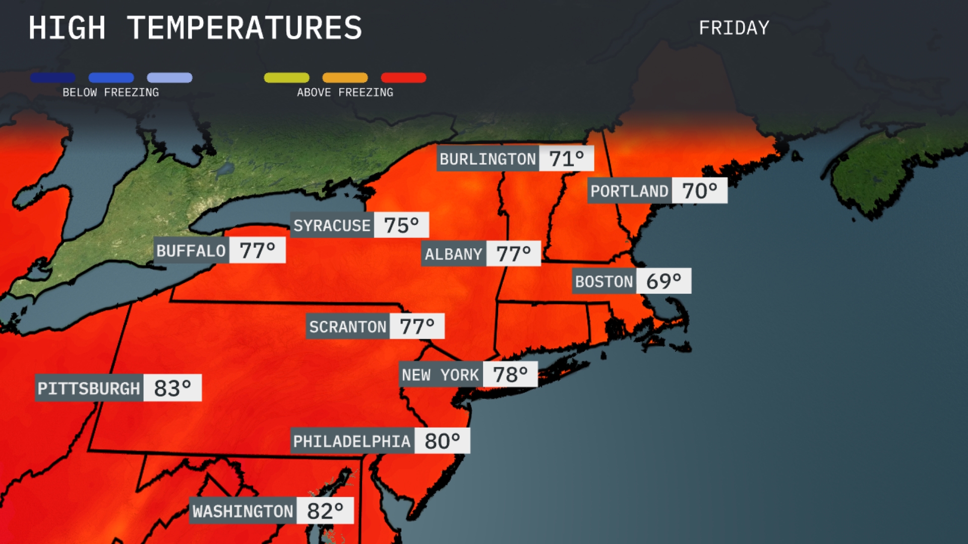 Tomorrow in the Northeast, expect some warm highs with Pittsburgh reaching 83 degrees, significantly above average for this time of year. Philadelphia will also enjoy a warm afternoon, hitting 80 degrees, while New York follows close behind at 78 degrees. Albany and Scranton will both see high temperatures around 77 degrees. Boston, however, will remain cooler at 69 degrees, reflecting the influence of a nearby weather pattern.