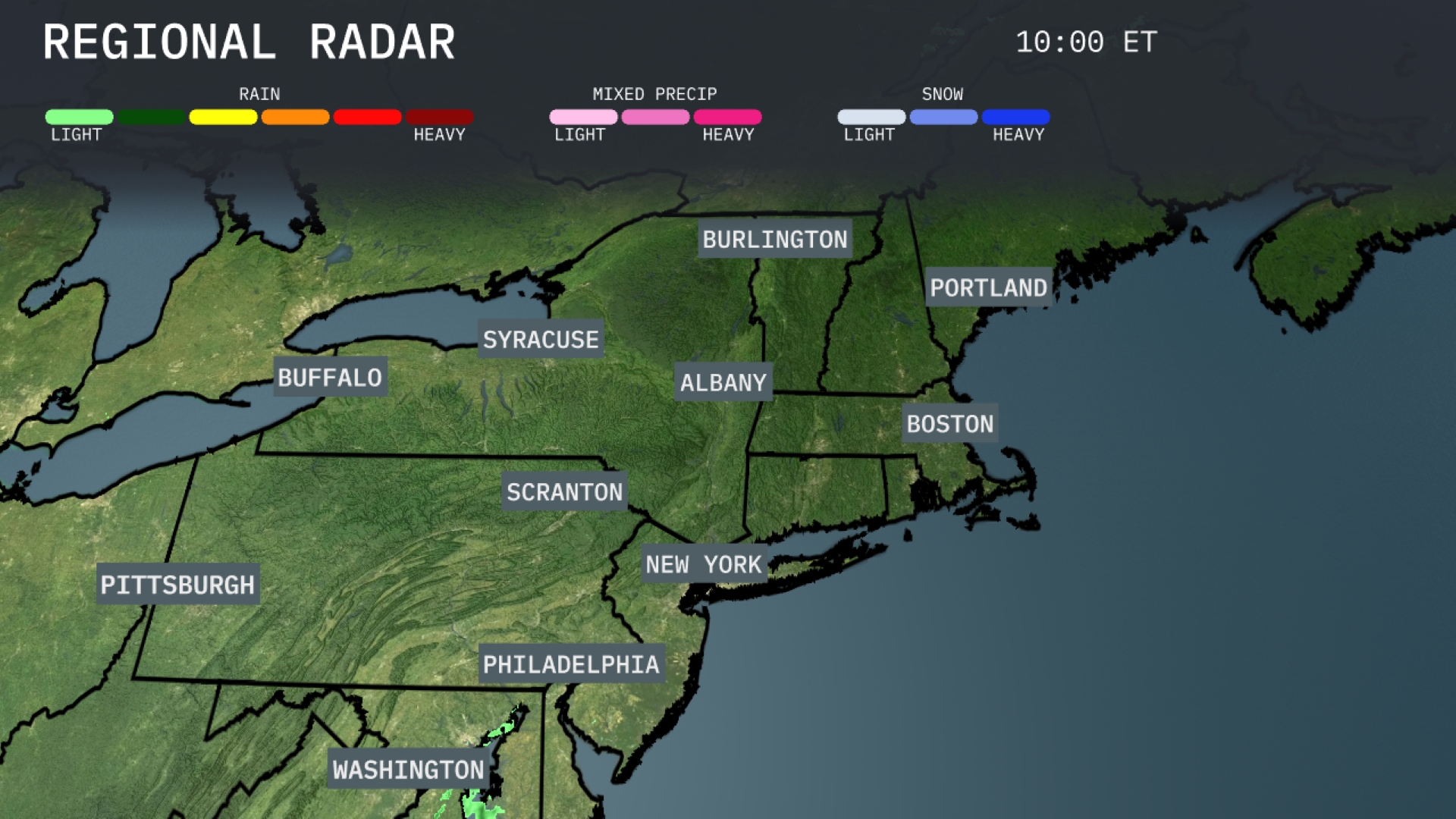The Northeast radar shows a peaceful start to the day with mostly clear skies. Scattered showers are beginning to form in the Washington area, hinting at a possibility of further development. Skies over Pittsburgh, Buffalo, and Albany remain clear, providing dry conditions across northern New York and Pennsylvania. Keep an eye on Philadelphia and Scranton, where clouds are on the rise, signaling a potential for rain later in the day.