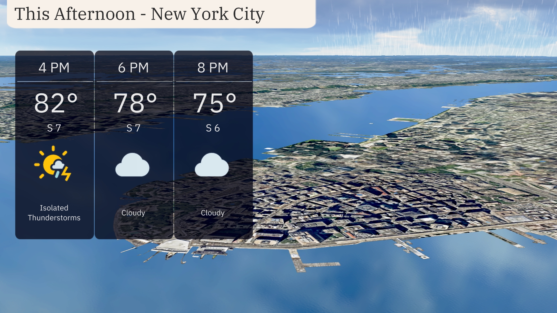 Afternoon in New York City brings temperatures around 82 degrees, with isolated thunderstorms possible. Winds are coming from the south at 7 mph, adding a touch of warmth to the atmosphere. By 6 PM, temperatures dip slightly to 78 degrees under cloudy skies, transitioning to 75 degrees at 8 PM. The cloud cover persists into the evening, with winds at 6 mph, maintaining a calm pattern.