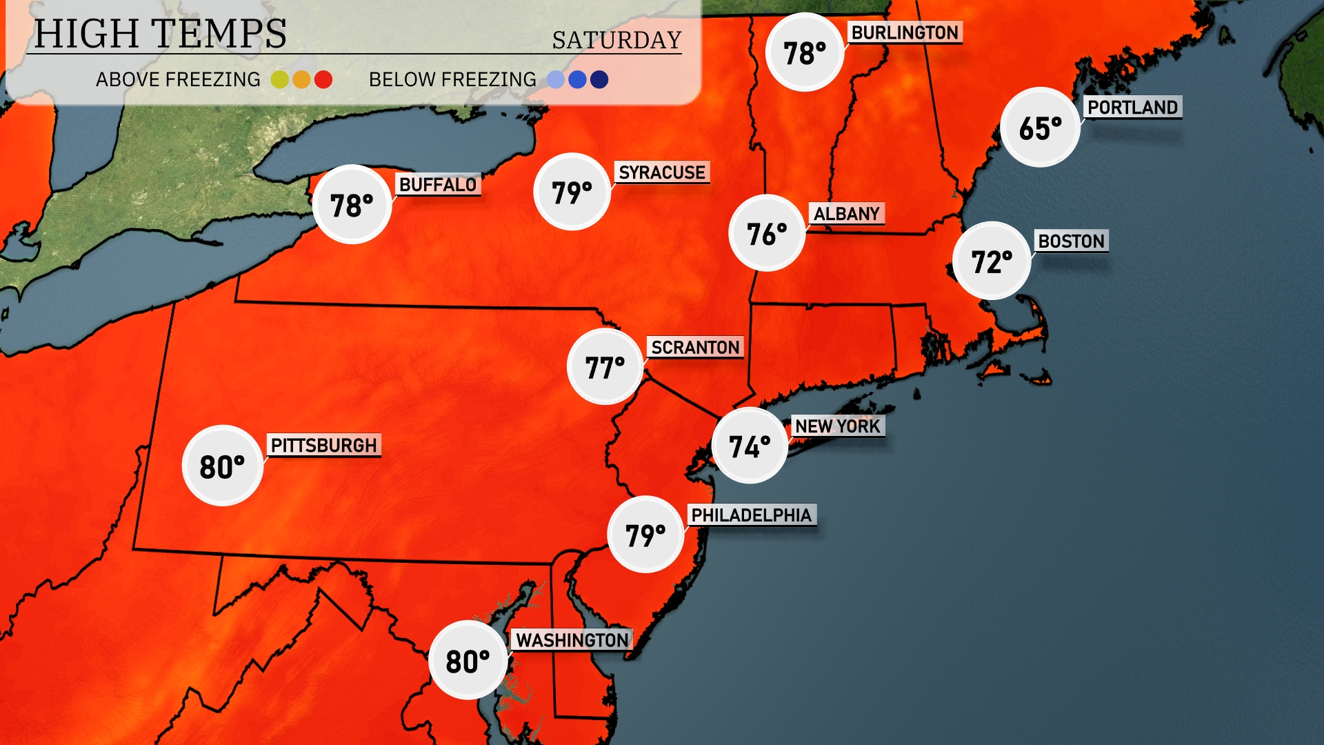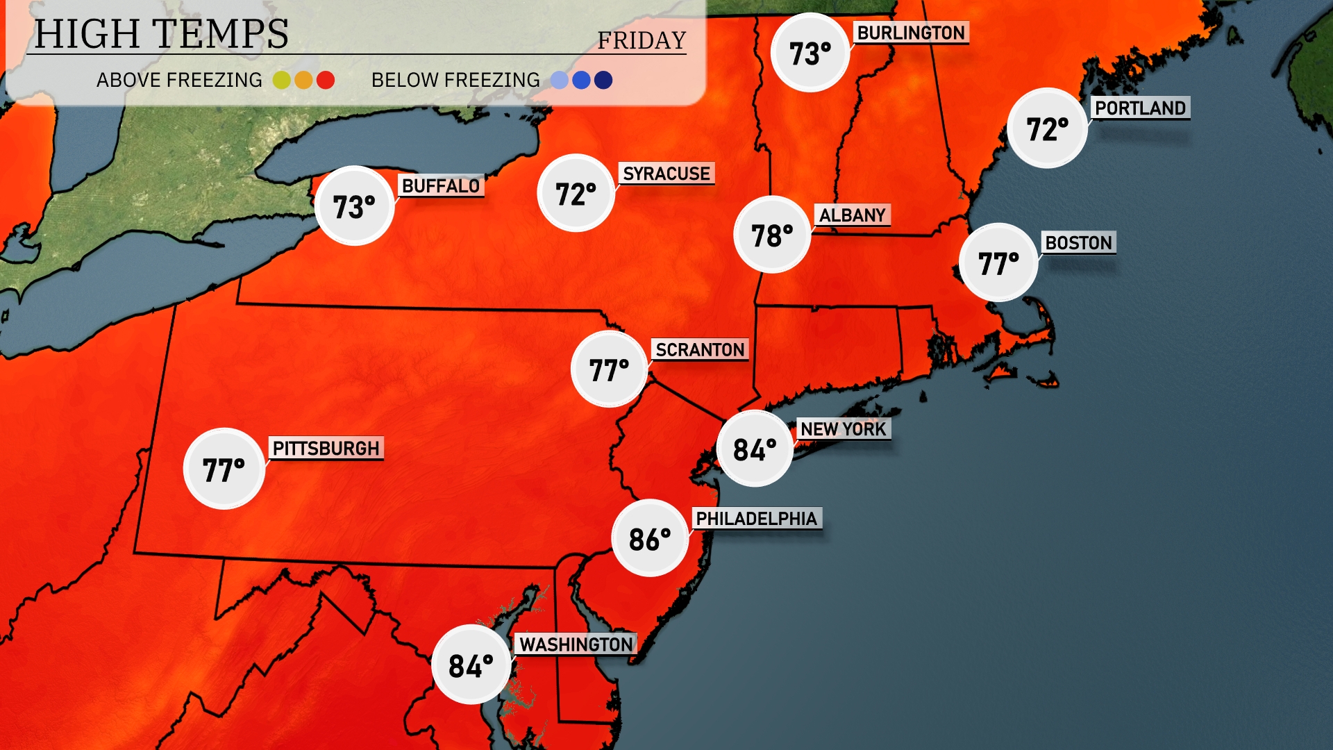Tomorrow, expect a warm day across the Northeast, with Pittsburgh reaching a high of 80 degrees. Philadelphia will also warm up to 79 degrees, while Scranton will see a high of 77. New York City isn’t far behind at 74 degrees, and Albany will hit 76. Meanwhile, Boston will be a bit cooler at 72 degrees, with Portland only reaching 65.