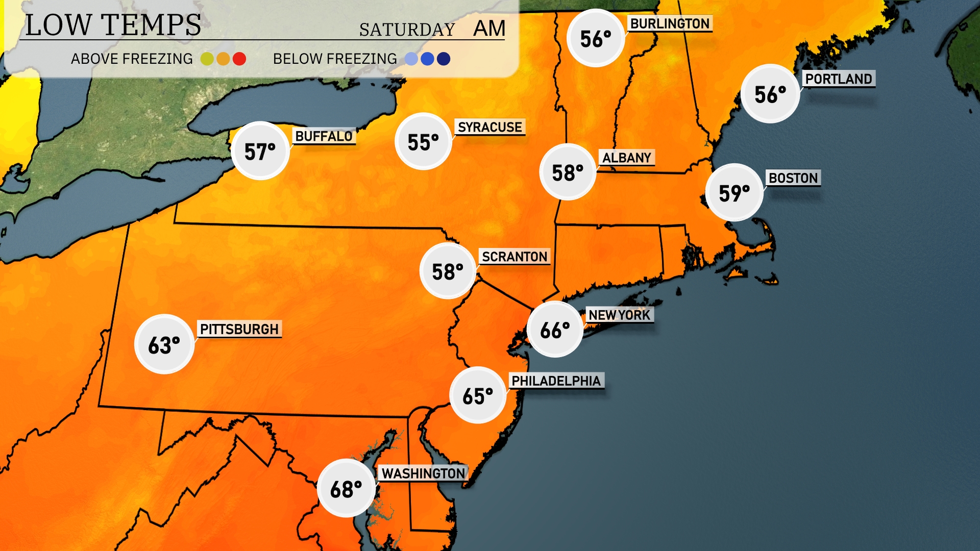 Tonight Buffalo will drop to a chilly 57 degrees, while Syracuse is expected to reach 55. Scranton and Albany will see lows of 58 degrees, and Boston is forecasting a low of 59.