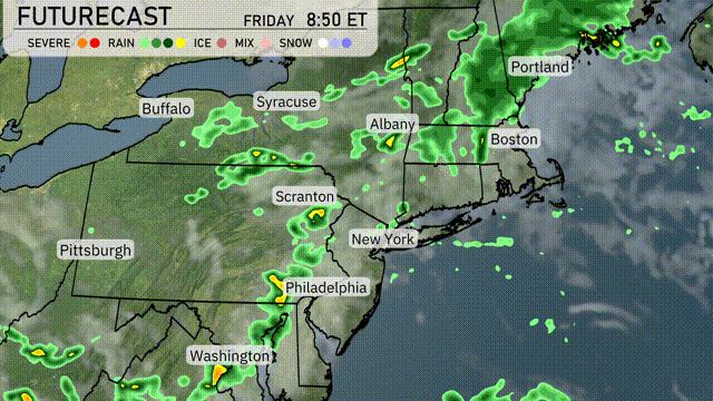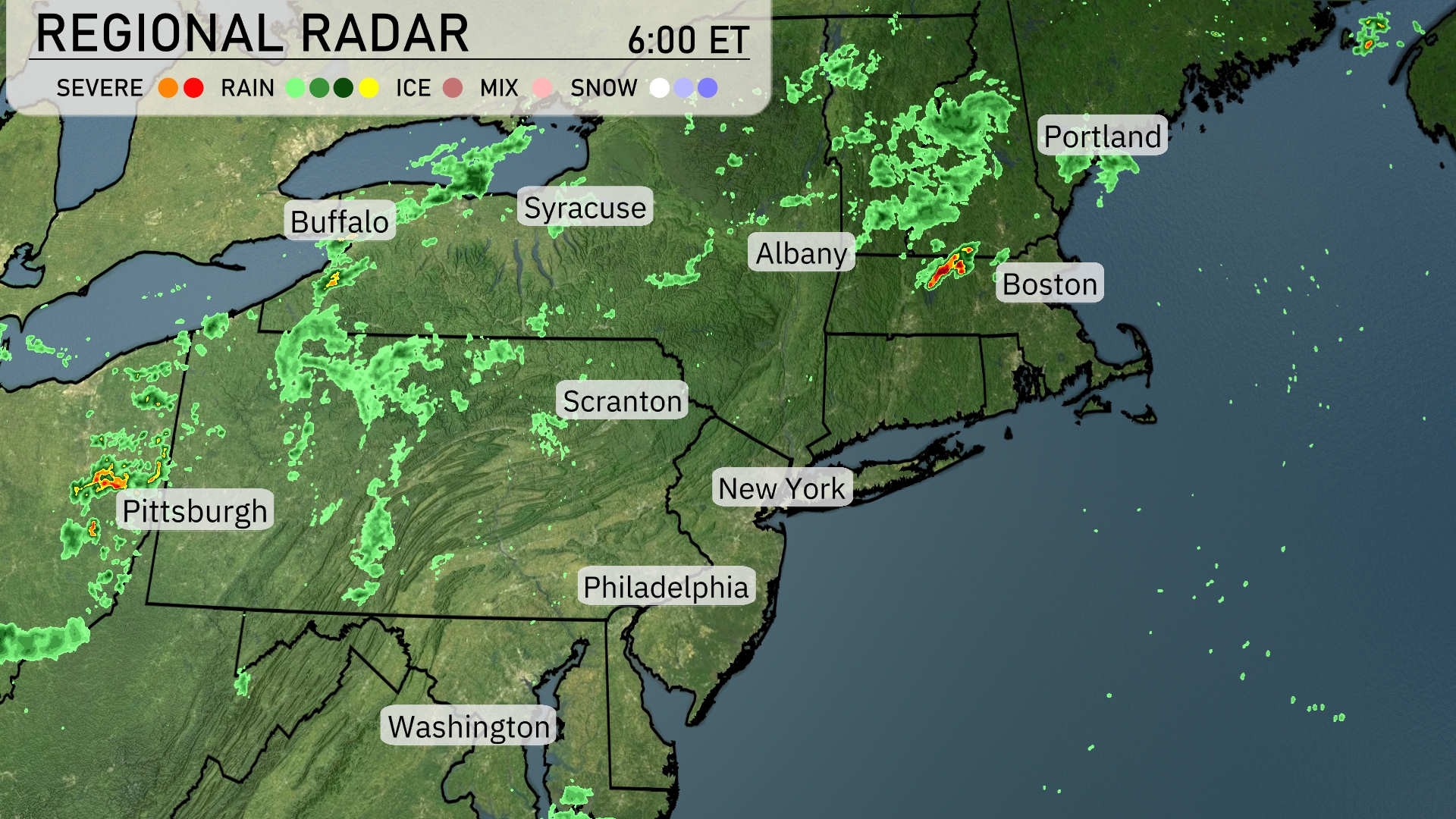 A cluster of showers and storms is moving through the Northeast, affecting areas from Syracuse to Albany. The heaviest rain is currently impacting Boston, with showers extending southwest towards Scranton. Pittsburgh and Buffalo are experiencing scattered rain showers, while the skies over New York City and Philadelphia remain mostly clear at this time. Farther south, Washington is also seeing dry conditions.