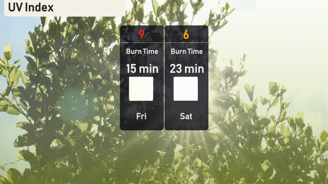 The UV index in New York City will be very high at 9 on Friday, with a burn time of about 15 minutes in direct sunlight. On Saturday, the index is forecasted to be moderate at 6, with a burn time around 23 minutes.