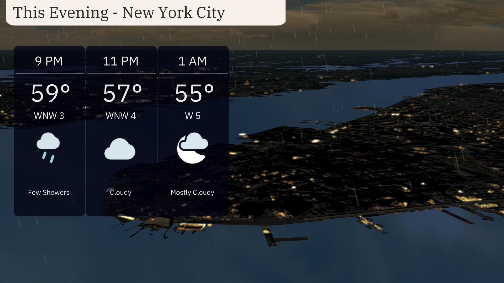 Temperatures in New York City this evening will start at 59 degrees at 9 PM, dropping to 55 degrees by 1 AM. Expect a few showers early on with a west-northwest wind at 3 to 5 miles per hour. Cloud cover increases as the evening progresses, becoming mostly cloudy by 1 AM. A calm night overall, just be prepared for a few showers.