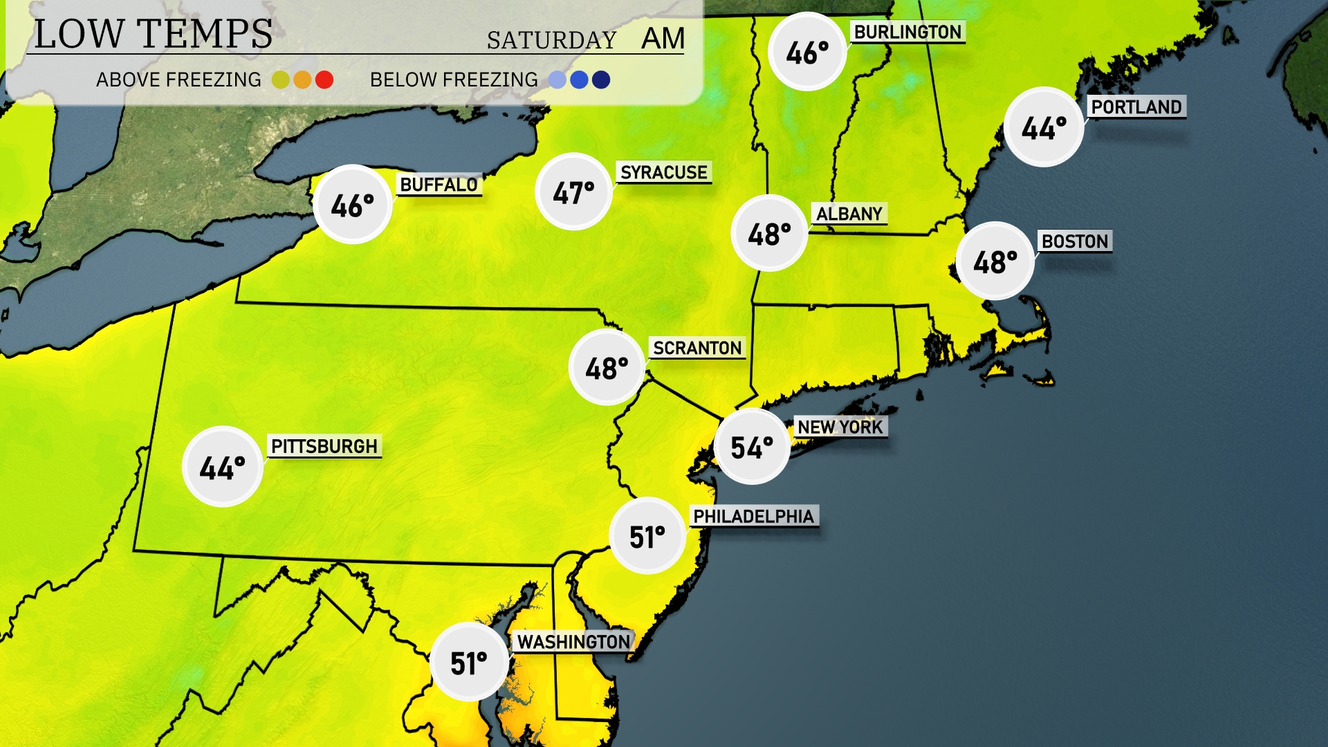 Tonight Buffalo will see a low of 46 degrees, while Syracuse drops to 47. Expect Scranton at 48 and New York City a bit milder at 54 degrees. Further south, Philadelphia will have a low of 51, while Pittsburgh will cool down to 44 degrees, the same for Portland.