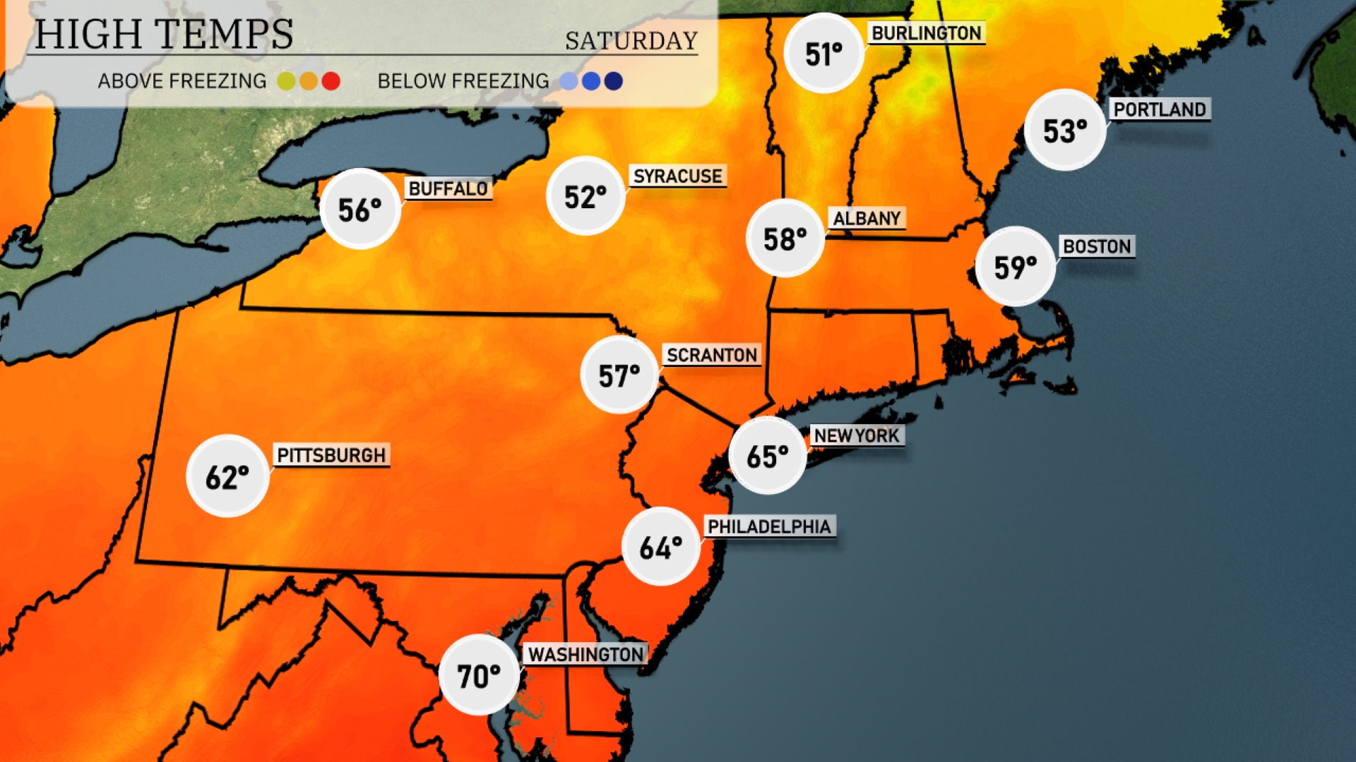 High temperatures in the Northeast tomorrow have Philadelphia reaching for a high of 64 degrees. Farther north, Buffalo will experience a cooler 56 degrees, with Syracuse slightly lower at 52 degrees. In the southern reaches, Washington, D.C. will enjoy a warm 70 degrees, contributing to a slight warming trend across the region.