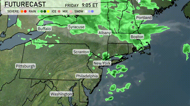 Expect a wet start to Friday across the Northeast, with rain moving through major cities like Boston, Albany, and Syracuse. Temperatures will be cooler, bringing a noticeable shift from the warm days earlier this week. Watch for heavier downpours during the morning commute, which could lead to brief periods of reduced visibility and localized flooding in low-lying areas. Clearing begins late Friday afternoon, paving the way for a cooler but drier weekend. Stay alert for potential impacts in travel plans and adjust accordingly.