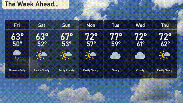 Thursday: Partly cloudy conditions with the temperature hitting 72 degrees, dropping to 62 at night.