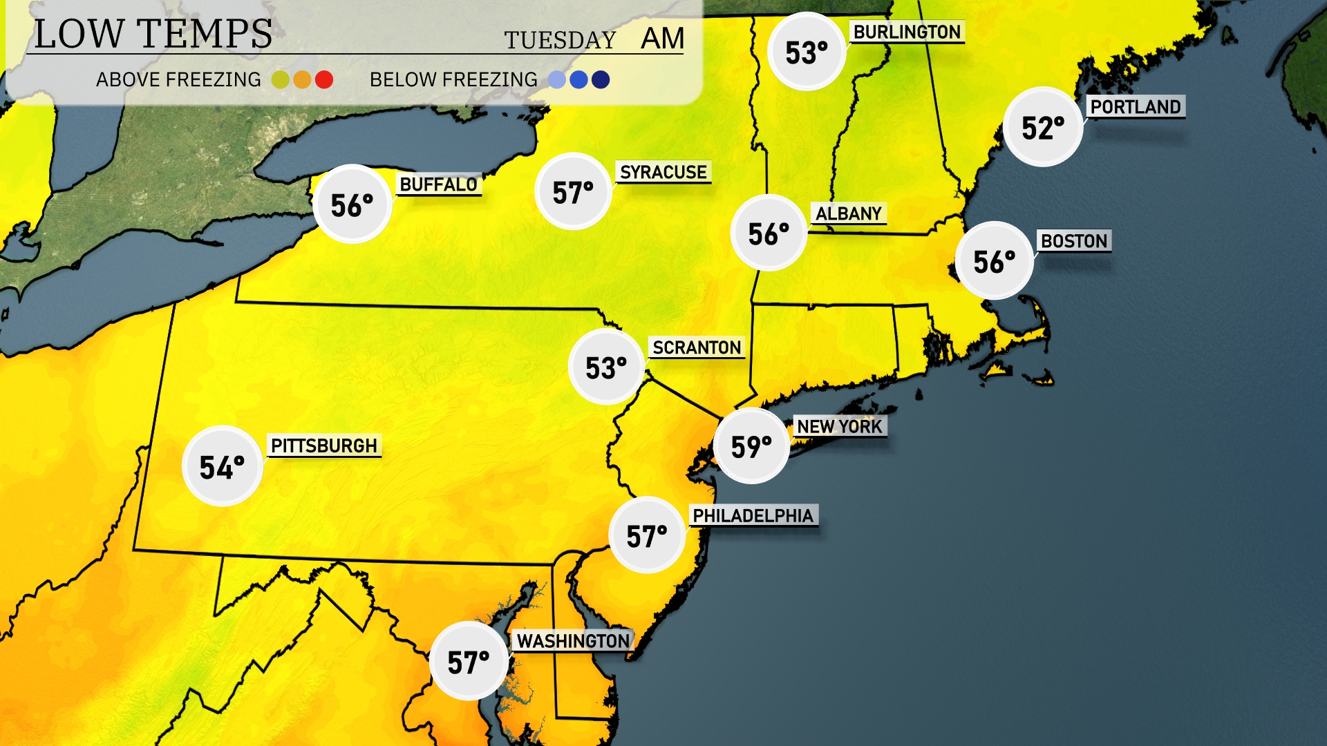 Tonight in the Northeast, expect a brisk evening with temperatures dipping down to 52 degrees in Portland and 56 degrees in Boston. New York City will see a low of 59, while Philadelphia cools to 57. Scranton will experience a cooler night at 53 degrees. Pittsburgh will have a low of 54, bringing in a refreshing chill across the region.