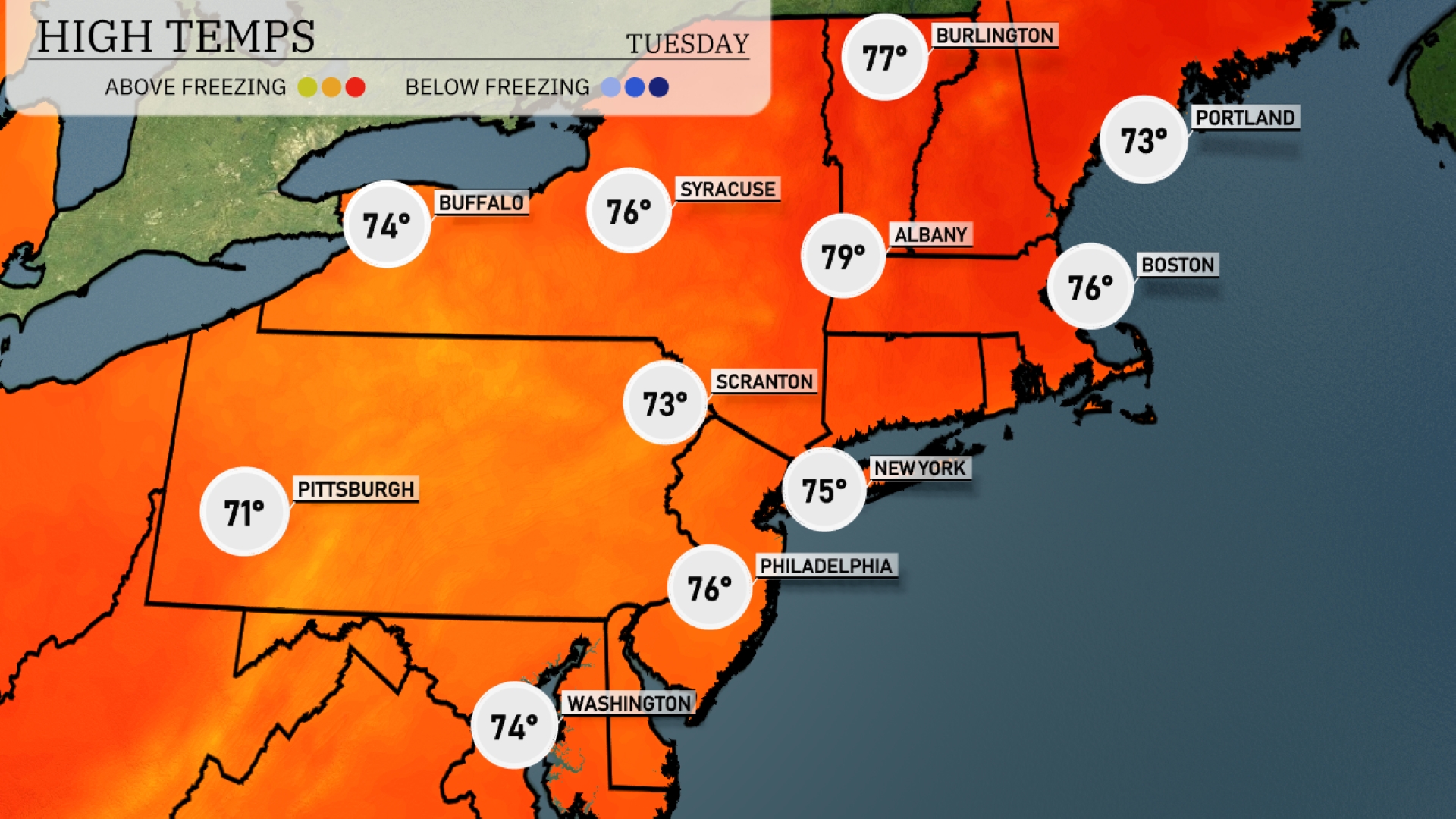 High temperatures in the Northeast are expected to be pleasantly warm for tomorrow. New York will reach a high of 75 degrees, while Philadelphia warms up to 76. Boston should see temperatures around 76 as well, with Albany slightly warmer at 79 degrees. Areas like Scranton will experience highs of 73, and Pittsburgh will get up to 71.