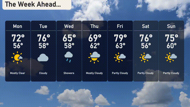 Monday: Mostly clear skies with a high of 72 degrees and a low of 56.