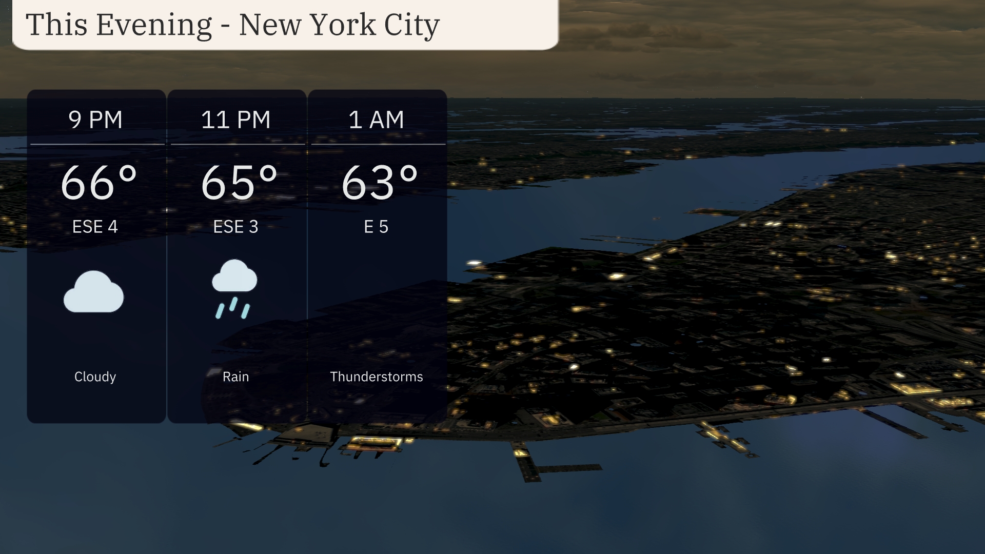 This evening in New York City, temperatures will gradually decrease from 66 degrees at 9 PM to 63 degrees by 1 AM. Expect cloudy skies to start, transitioning to rain by 11 PM, with the possibility of thunderstorms later into the night. Winds will be easing from the east-southeast at 4 mph to 5 mph. Prepare for wet conditions if you’re heading out late tonight.