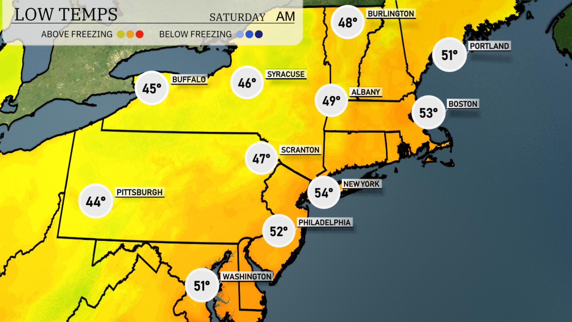 Tonight Pittsburgh will see a low of 44 degrees, while Scranton is slightly warmer at 47. New York City dips to 54, but it’s chilly in Buffalo at 45 degrees. Albany will be cooler with a low of 49, and Boston expects to settle at 53.