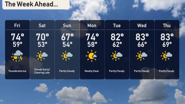 Thursday: Continued partly cloudy skies, with temperatures peaking at 83 degrees during the day and dropping to 69 at night.