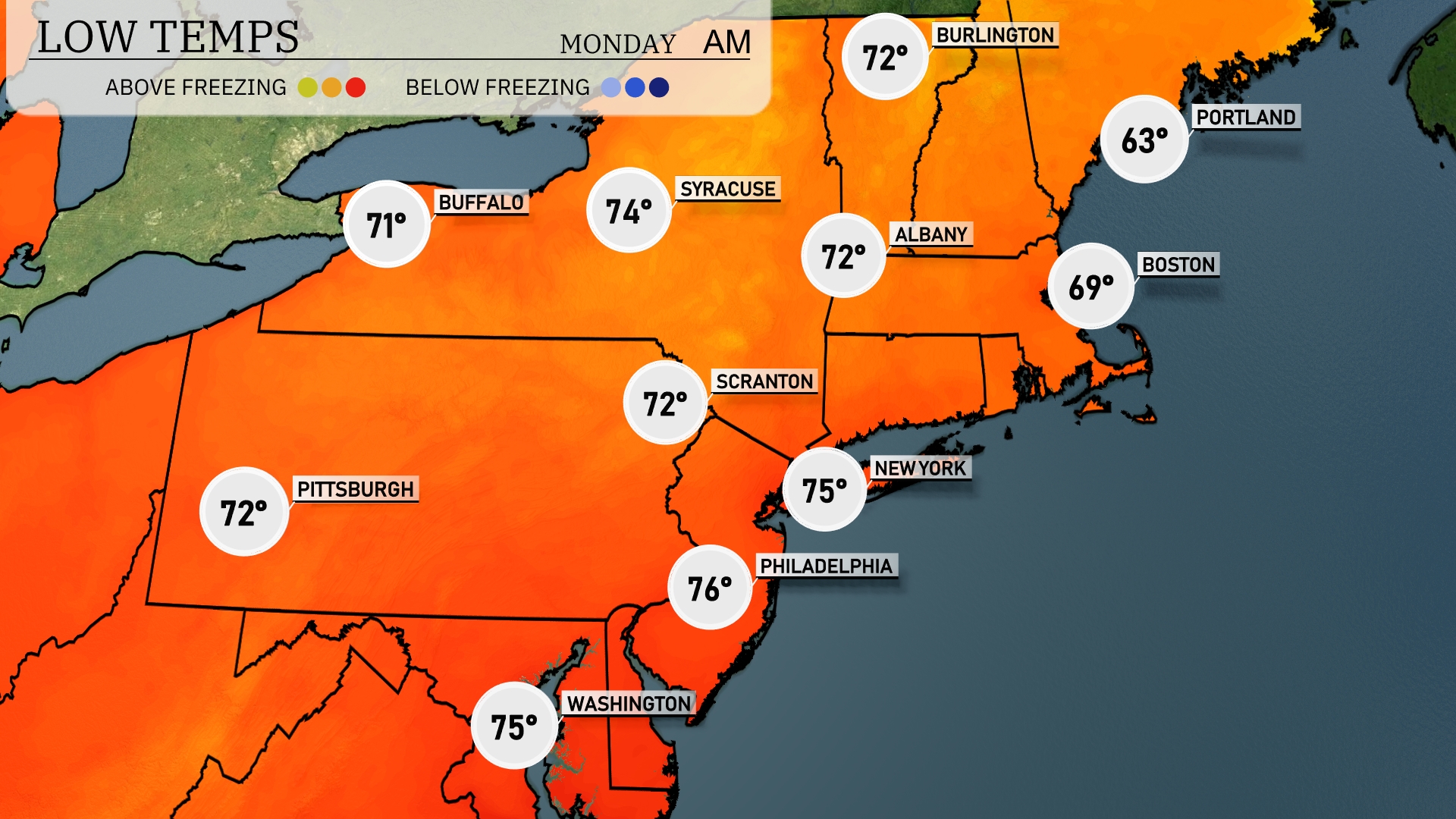 Tonight, temperatures in the Northeast will experience mild lows. New York City will see a low of 75 degrees, while Philadelphia is expected to drop to 76. Boston will cool down to 69 degrees, and Albany will reach 72 degrees. Meanwhile, Buffalo will have a low of 71 degrees, setting the stage for a comfortably warm night across the region.