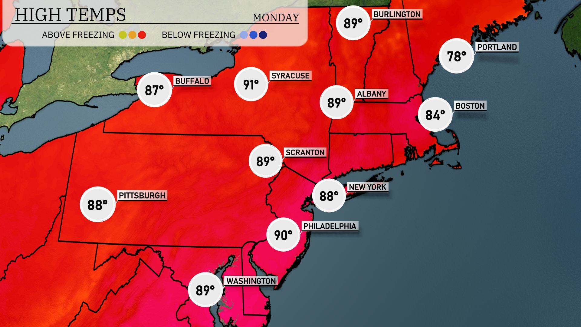Tomorrow, temperatures in the Northeast will soar, with Philadelphia hitting a scorching 90 degrees. New York won’t be far behind, reaching 88 degrees, while Boston will see a more moderate high of 84 degrees. Cities like Scranton and Syracuse can expect highs of 89 and 91 degrees, respectively, both above the seasonal averages. Pittsburgh will also warm up to 88 degrees, indicating a widespread heat trend across the region. Meanwhile, Portland will remain cooler at 78 degrees, providing some relief from the heat.