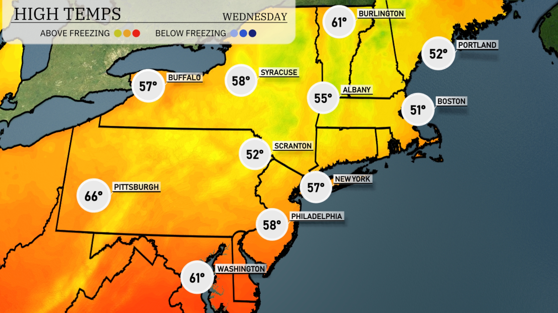 Today’s regional high temperatures in the Northeast show a cool trend across the area. In New York City, expect a high of 57 degrees, while Philadelphia will see a slightly warmer 58 degrees. Farther north, Syracuse reaches a high of 58 degrees, but Buffalo is cooler at just 57. Albany trails behind at 55 degrees, and over in Boston, temperatures are notably low at 51 degrees. Pittsburgh offers a contrast with a more pleasant high of 66 degrees.