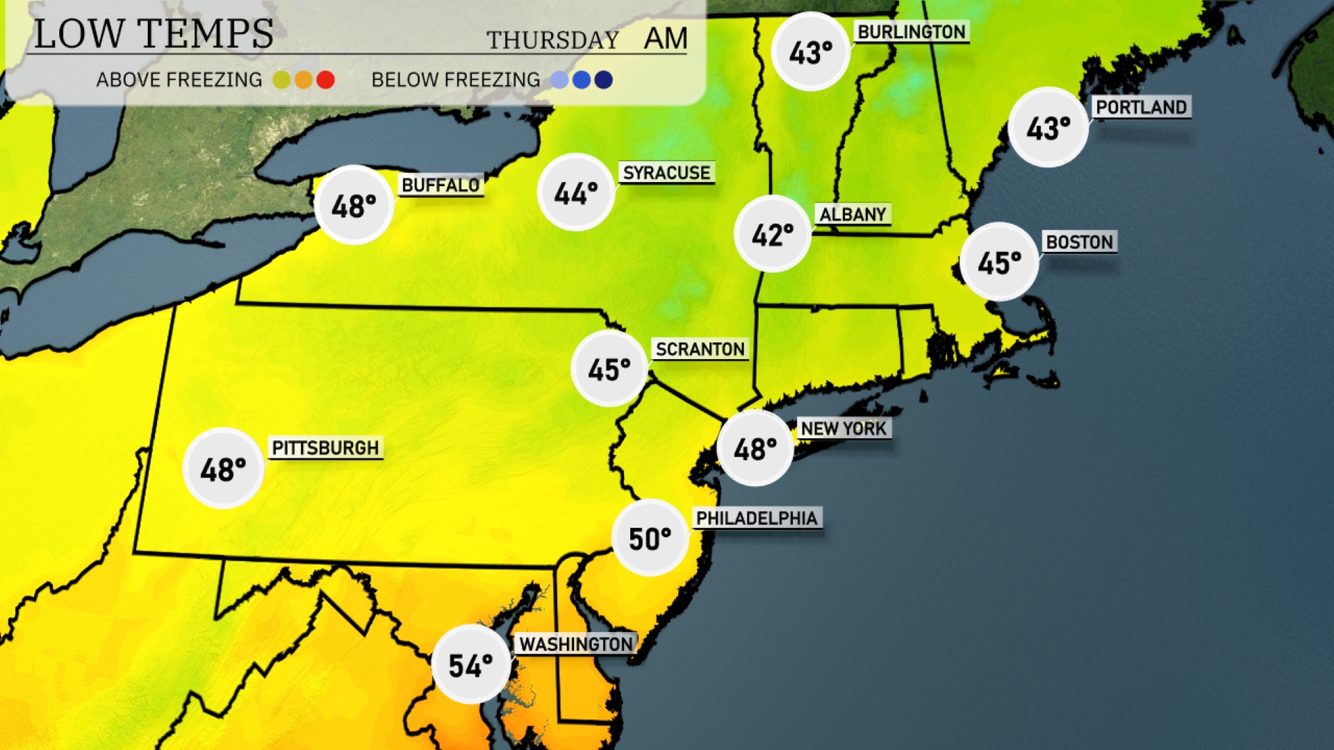 Tonight in the Northeast, temperatures will dip significantly as a cold front moves through. Albany will see a low of 42 degrees, while Syracuse will be a bit cooler at 44. Scranton expects a low of 45, and both New York City and Boston will settle at 48. Pittsburgh will be slightly warmer at 48, but expect noticeable chill in the area.