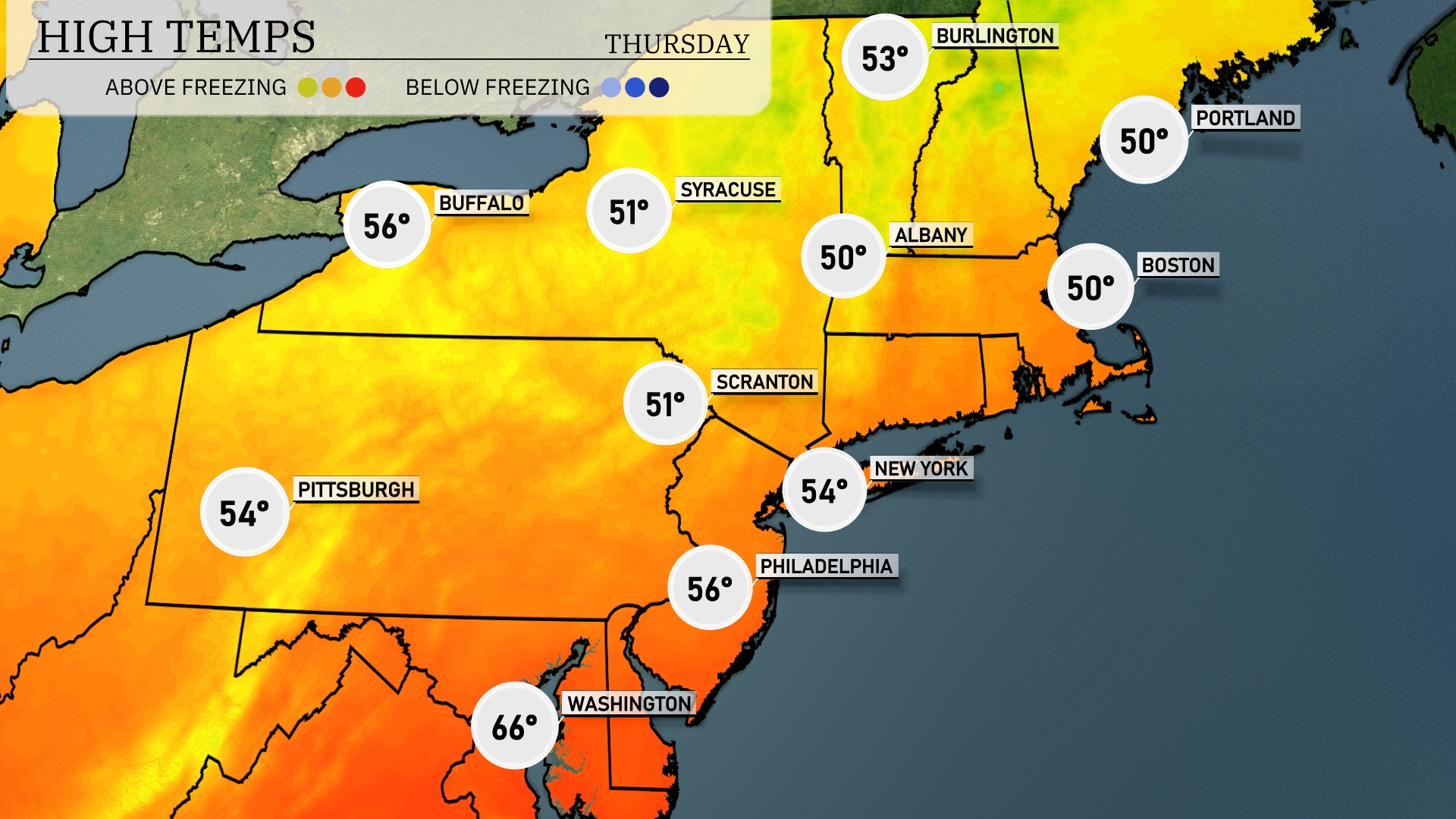 For high temperatures tomorrow in the Northeast, we’re looking at above-average warmth across the region. New York City will reach around 54 degrees, while Philadelphia can expect a high of 56. Farther north, Albany is forecasted to see a high of 50 degrees, and Scranton will also hit 51 degrees. Buffalo’s high will be slightly cooler at 56 degrees, but overall, temperatures are milder compared to seasonal norms.