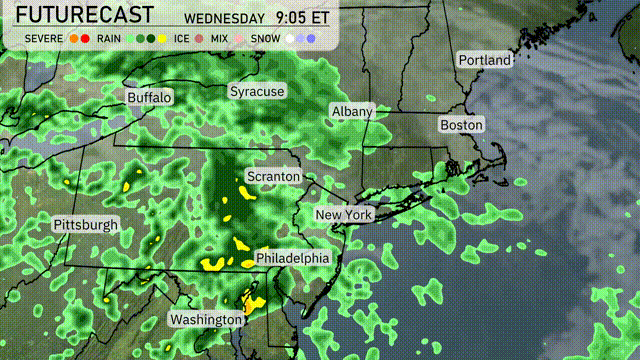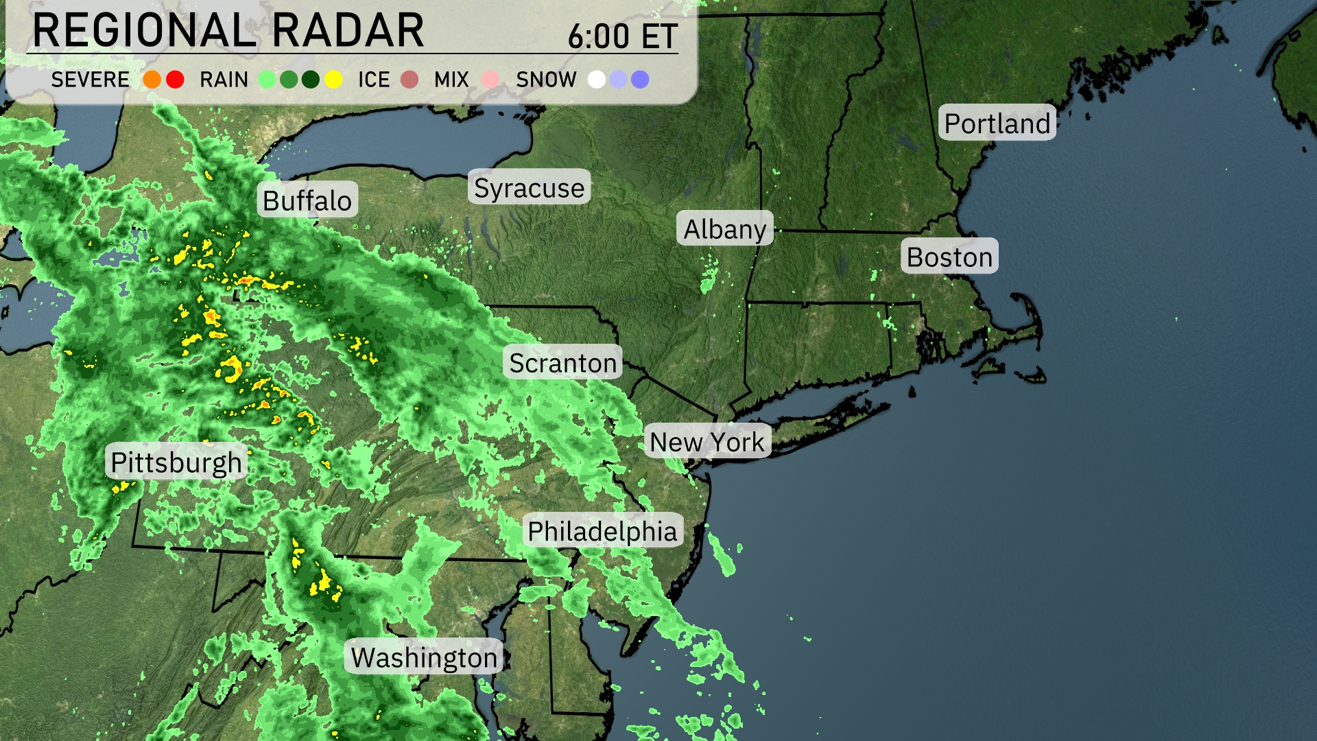 On the Regional Radar, rain is sweeping across the Northeast, moving eastward from Pittsburgh, where it is currently heaviest. This rain extends through Buffalo and Scranton, and is approaching New York City with steady showers. Philadelphia is experiencing intermittent rain as the system progresses. Farther northeast, cities such as Albany and Boston are still dry but should prepare for incoming precipitation. Washington D.C., however, may catch a break as the bulk of the rain remains to the north.