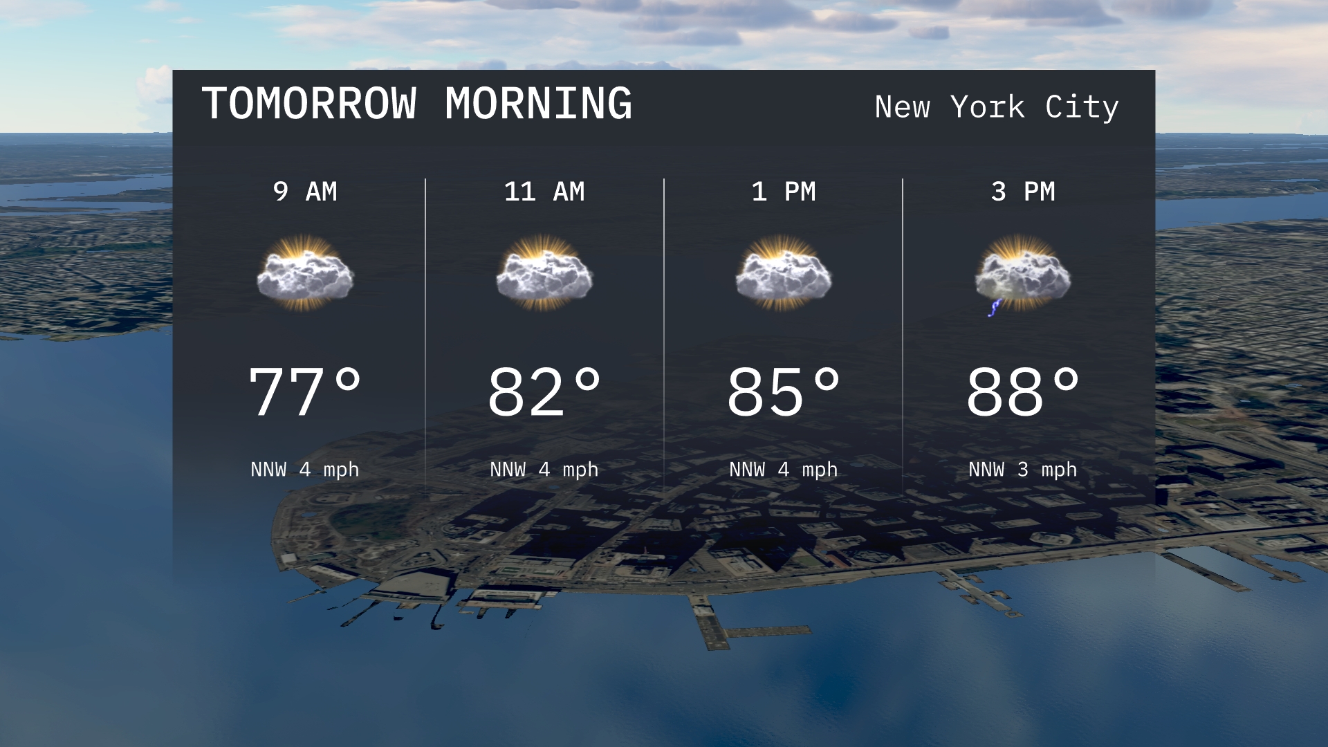 For tomorrow morning in New York City, expect a muggy, warm start at 77 degrees around 9 AM with a chance of rain. Temperatures climb to 82 degrees by 11 AM, with a consistent northwest wind. Showers are possible.