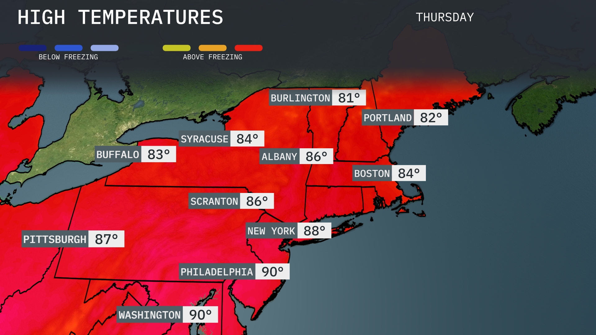 Tomorrow in the Northeast, expect a noticeably warm day with highs reaching 90 degrees in both Washington, D.C. and Philadelphia. New York City is forecasted to hit 88 degrees, while Albany and Scranton will also see temperatures around 86 degrees. Boston is expected to be a bit cooler at 84 degrees, and further north, Syracuse will warm to 84 degrees as well.