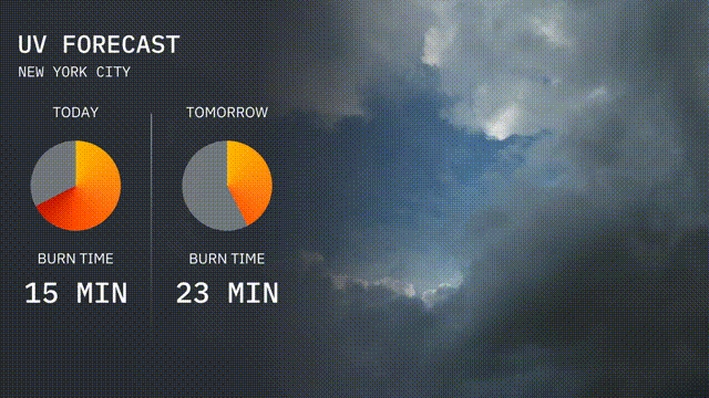 The UV index for New York City today is high, with a potential burn time of about 15 minutes under direct sunlight. Tomorrow, the index dips slightly but remains moderate, with a burn time of 23 minutes.
