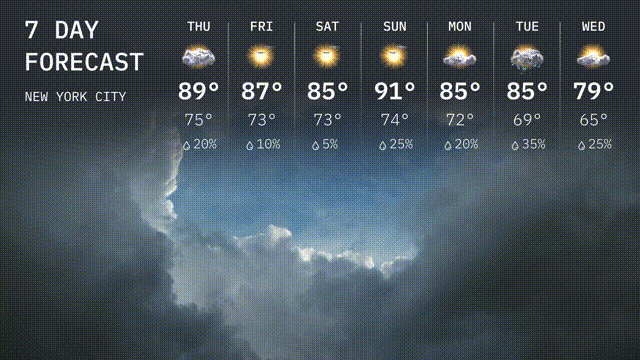 For the 7-day forecast in New York City: Thursday: Mostly sunny with a high of 89 degrees and a low of 75 degrees. A slight chance of showers at 20 percent. Friday: Partly sunny with temperatures peaking at 87 degrees during the day and dipping to 73 overnight. A 10 percent chance of rain. Saturday: Partly sunny skies with a high of 85 degrees and a low of 73 degrees. A 5 percent chance of rain. Sunday: A high of 91 degrees with a mild warming trend, a low of 74 degrees, and a 25 percent chance of showers. Monday: A high of 85 degrees with a chance of showers at 20 percent, cooling to 72 at night. Tuesday: Showers likely, with a high of 85 degrees, and temperatures going down to 69 degrees. Rain chance increases to 35 percent. Wednesday: Expect more showers with a high of 79 degrees and a low of 65 degrees, with a 25 percent chance of rain.