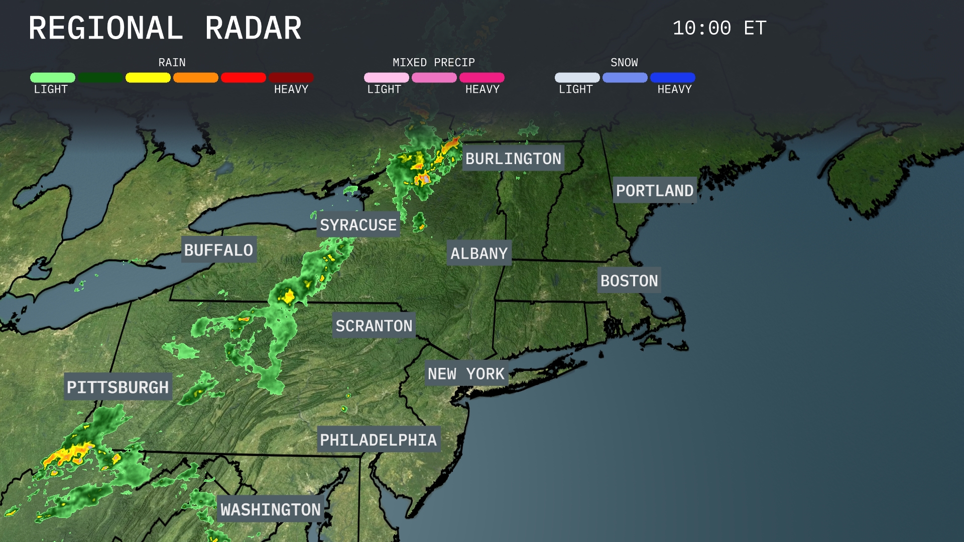 A line of heavy showers and thunderstorms is advancing across central Pennsylvania, stretching from Pittsburgh and moving northeast towards Syracuse. Albany is experiencing lighter rain, while Burlington is on the edge of the precipitation fields suggesting imminent wet weather. Notably, Boston and Portland remain dry with clearer skies predominating. Philadelphia and New York are also clear, providing a break from the rain seen further west.
