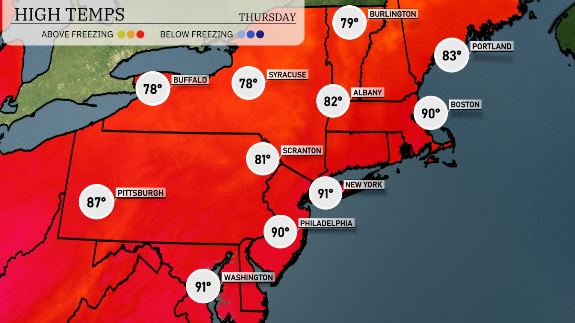 Tomorrow, New York City hits a scorching 91 degrees. Philadelphia will match that with a high of 90 degrees, while Pittsburgh lingers slightly cooler at 87 degrees. In the northern tier, Albany reaches 82 degrees and Buffalo sits at 78.